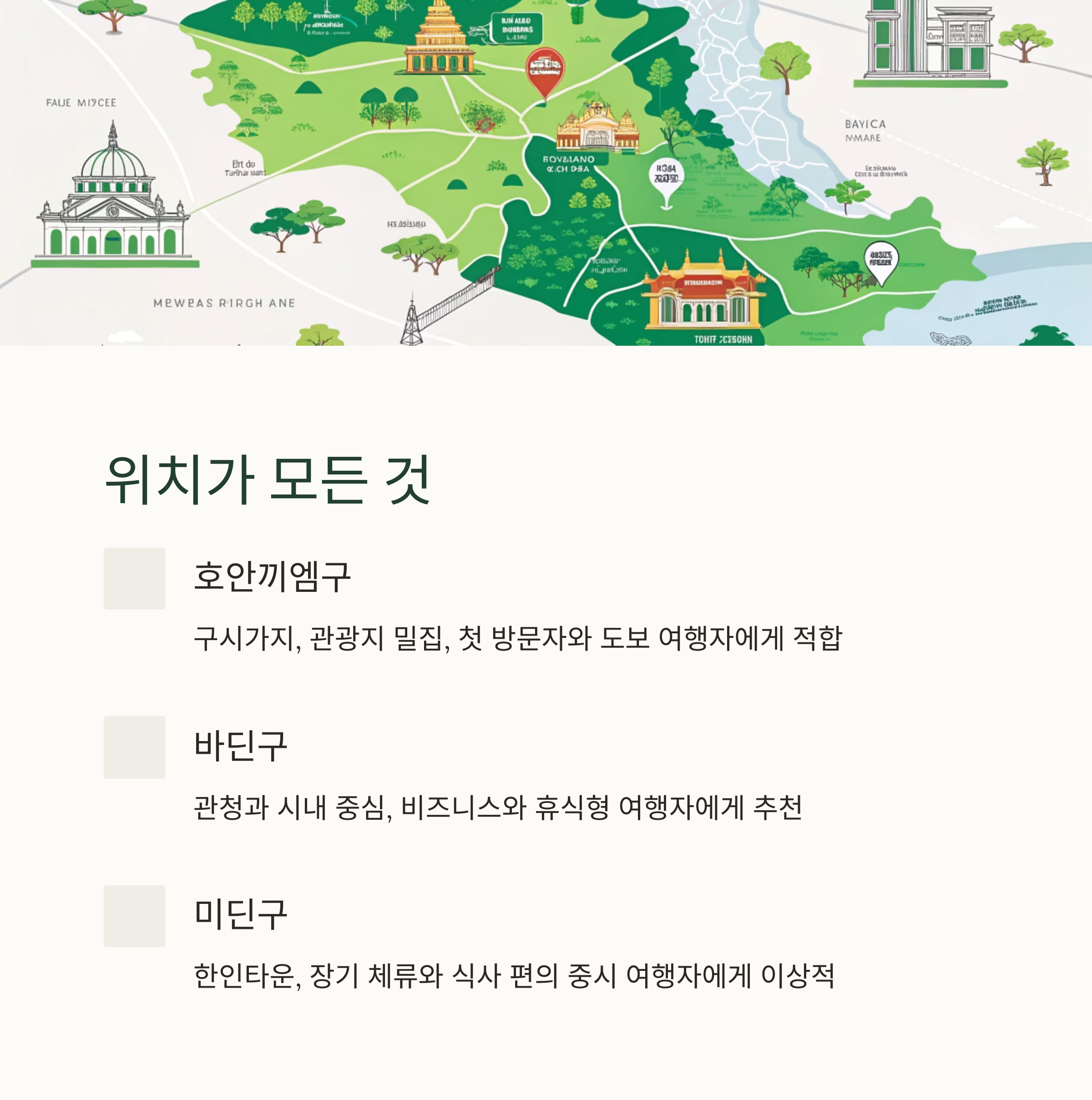 | 호안끼엠구 | 구시가지, 관광지 밀집 지역 | 첫 방문자, 도보 여행자 |