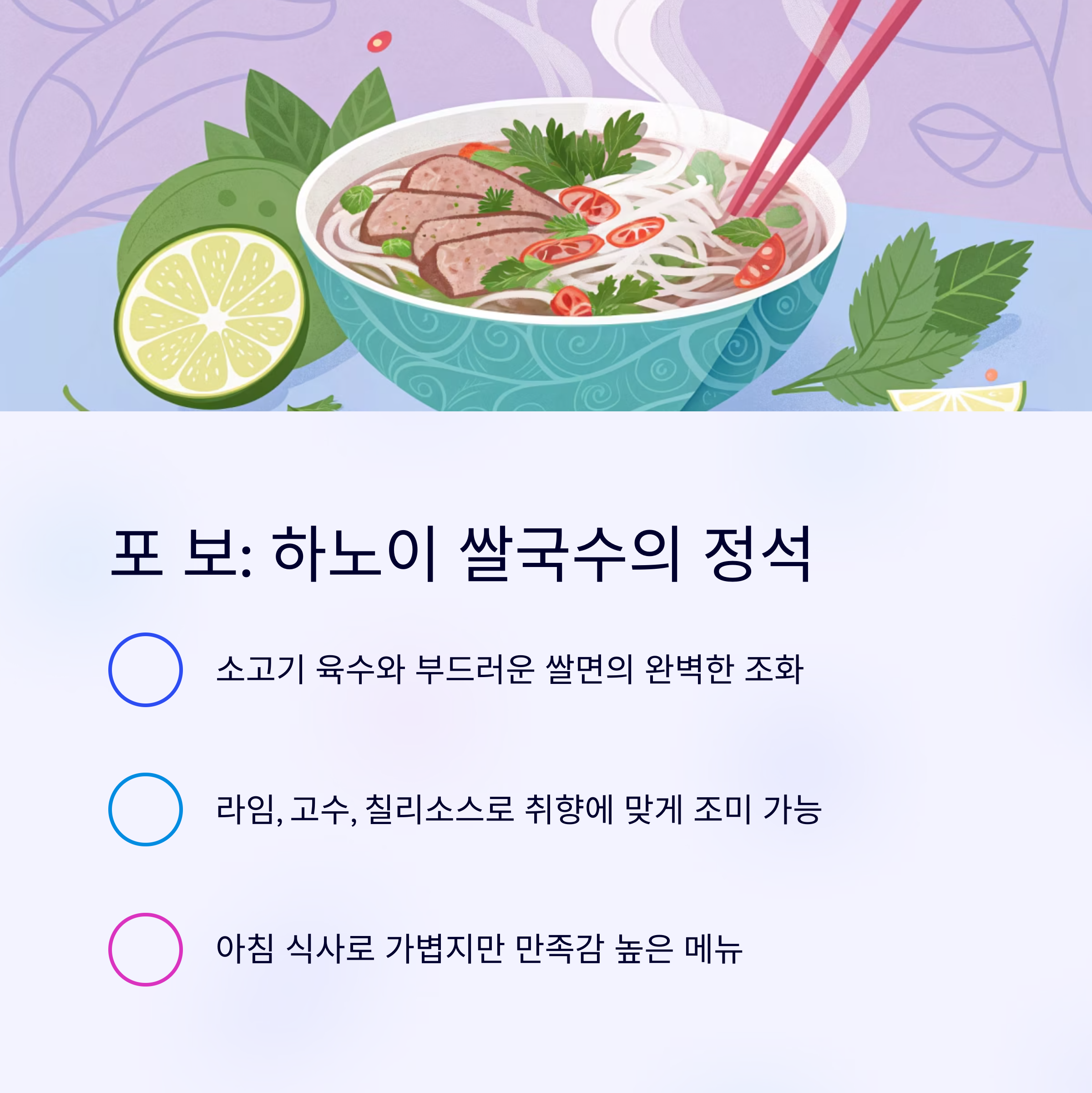 | 포 보 | 소고기, 쌀면, 허브 | 아침, 점심 | 맑고 깊은 국물의 쌀국수 |