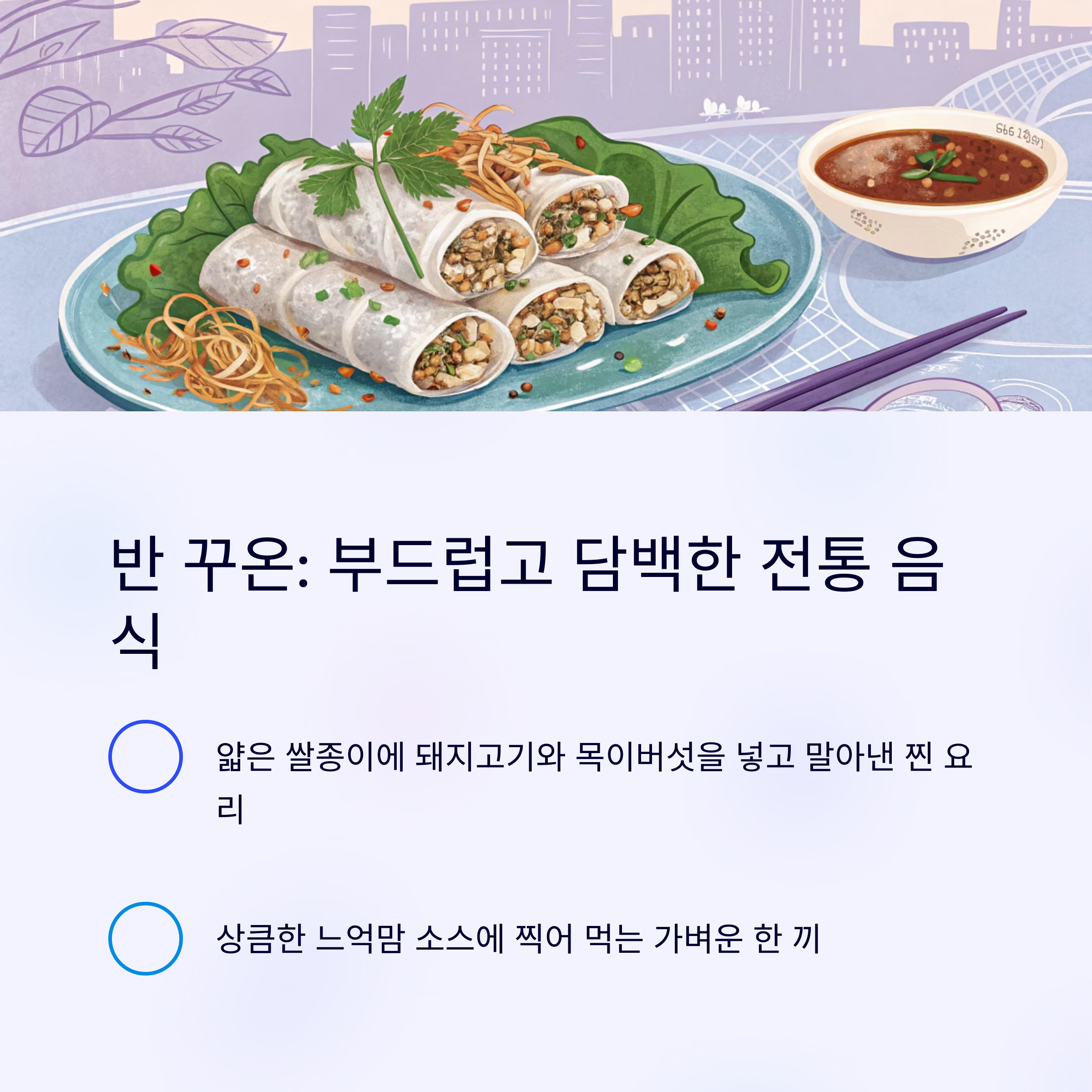 | 반 꾸온 | 쌀피, 돼지고기, 버섯 | 아침, 간식 | 부드럽고 담백한 찐 쌀말이 요리 |