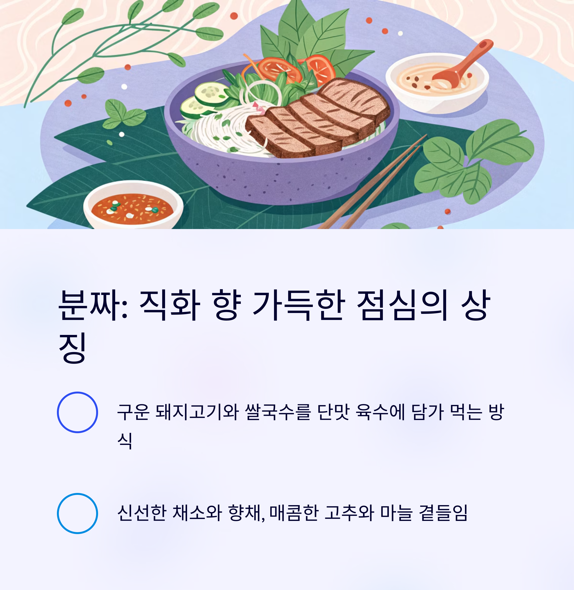 | 분짜 | 돼지고기, 쌀면, 허브 | 점심 | 직화고기+단국물 조합, 향채 풍부 |