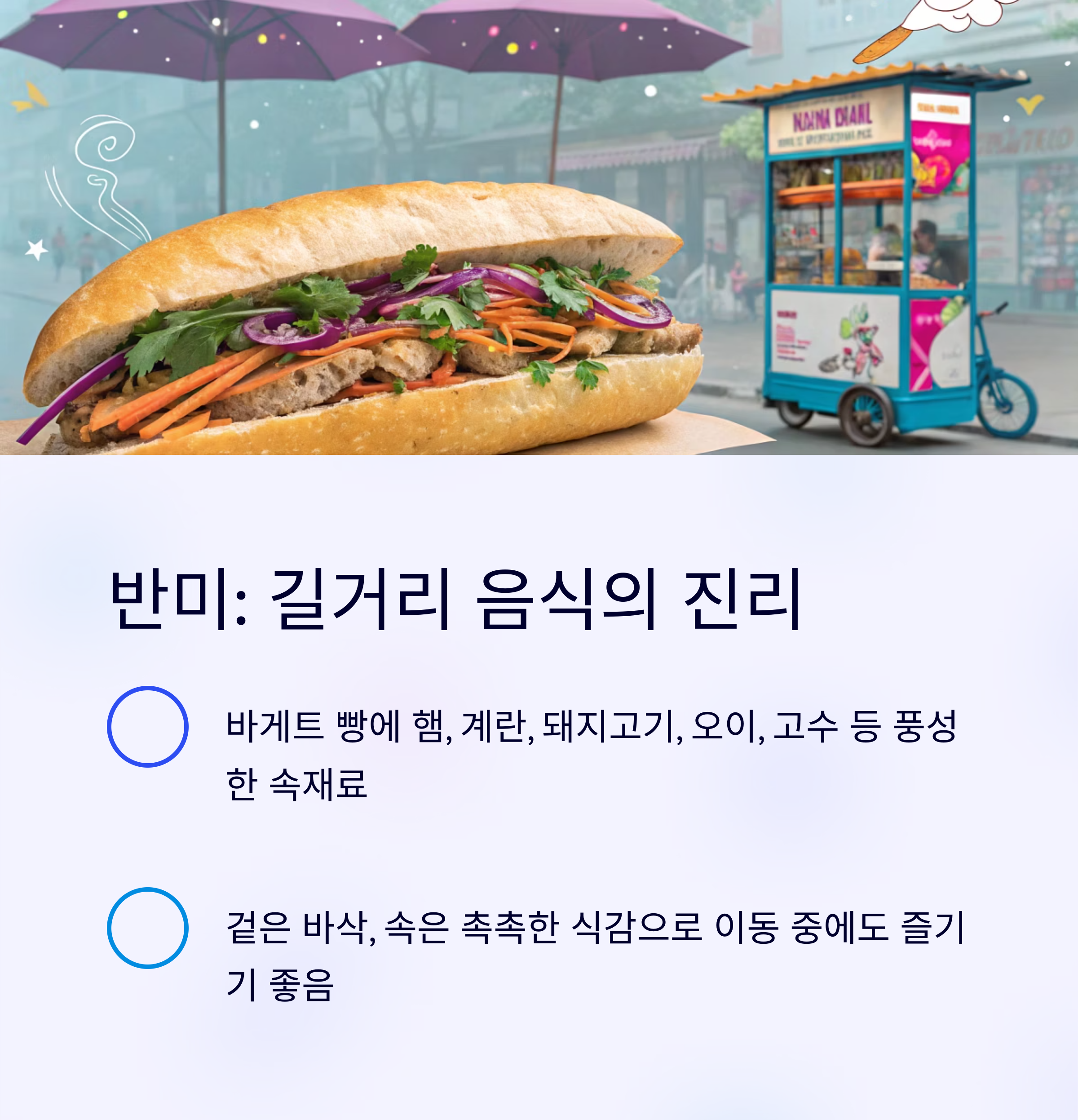 | 반미 | 바게트, 햄, 오이 등 | 아침, 간식, 이동 중 | 바삭한 빵 속 풍부한 속재료 |
