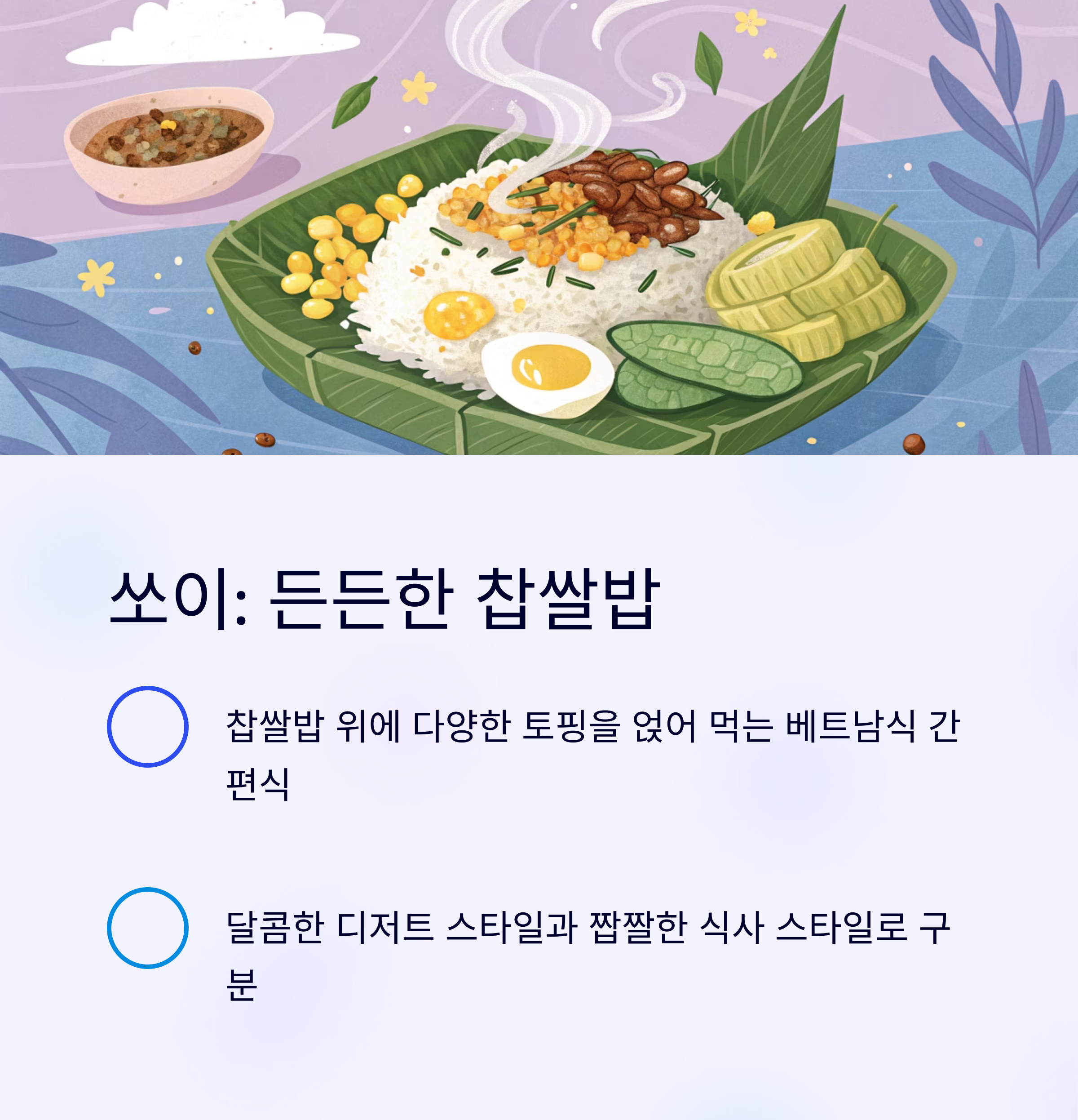 | 쏘이 | 찹쌀, 토핑(고기·콩 등) | 아침, 점심 | 든든하고 간단한 로컬 한 끼 |