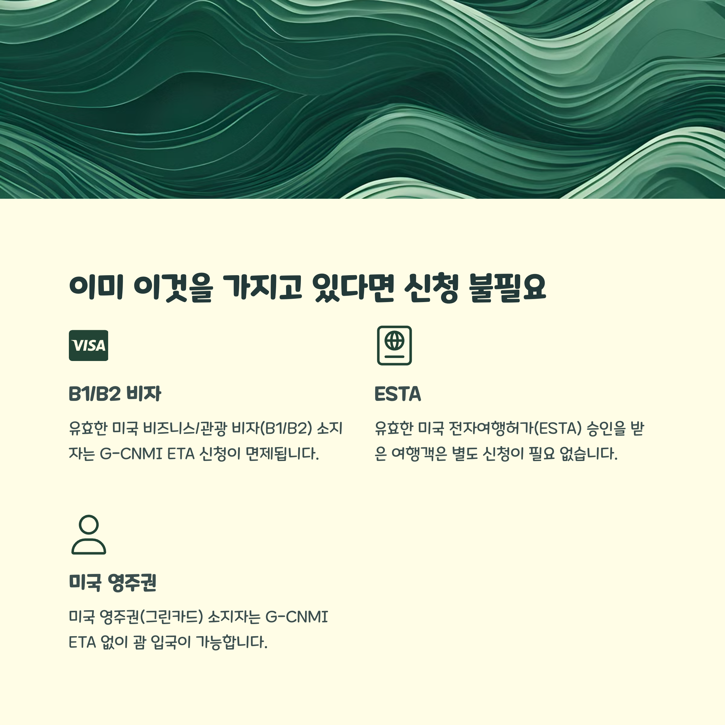 | ETA 신청 | 최소 출발 5일 전까지 신청해야 하며, B1/B2 비자 소지자는 제외됩니다. |