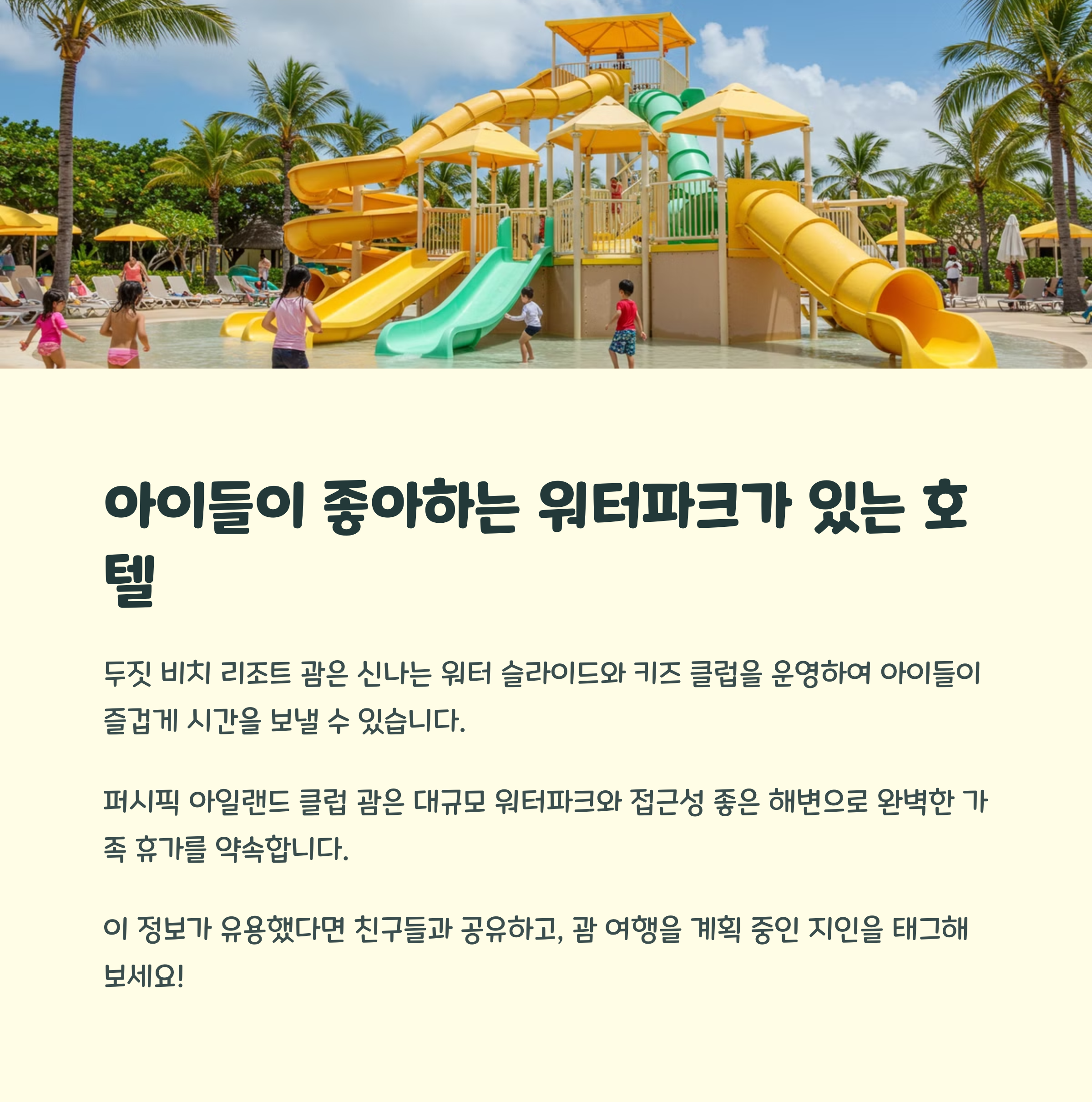 | 가족 여행 호텔 | Dusit Thani, Hyatt Regency, PIC Guam 등 가족 친화적 호텔 추천 |