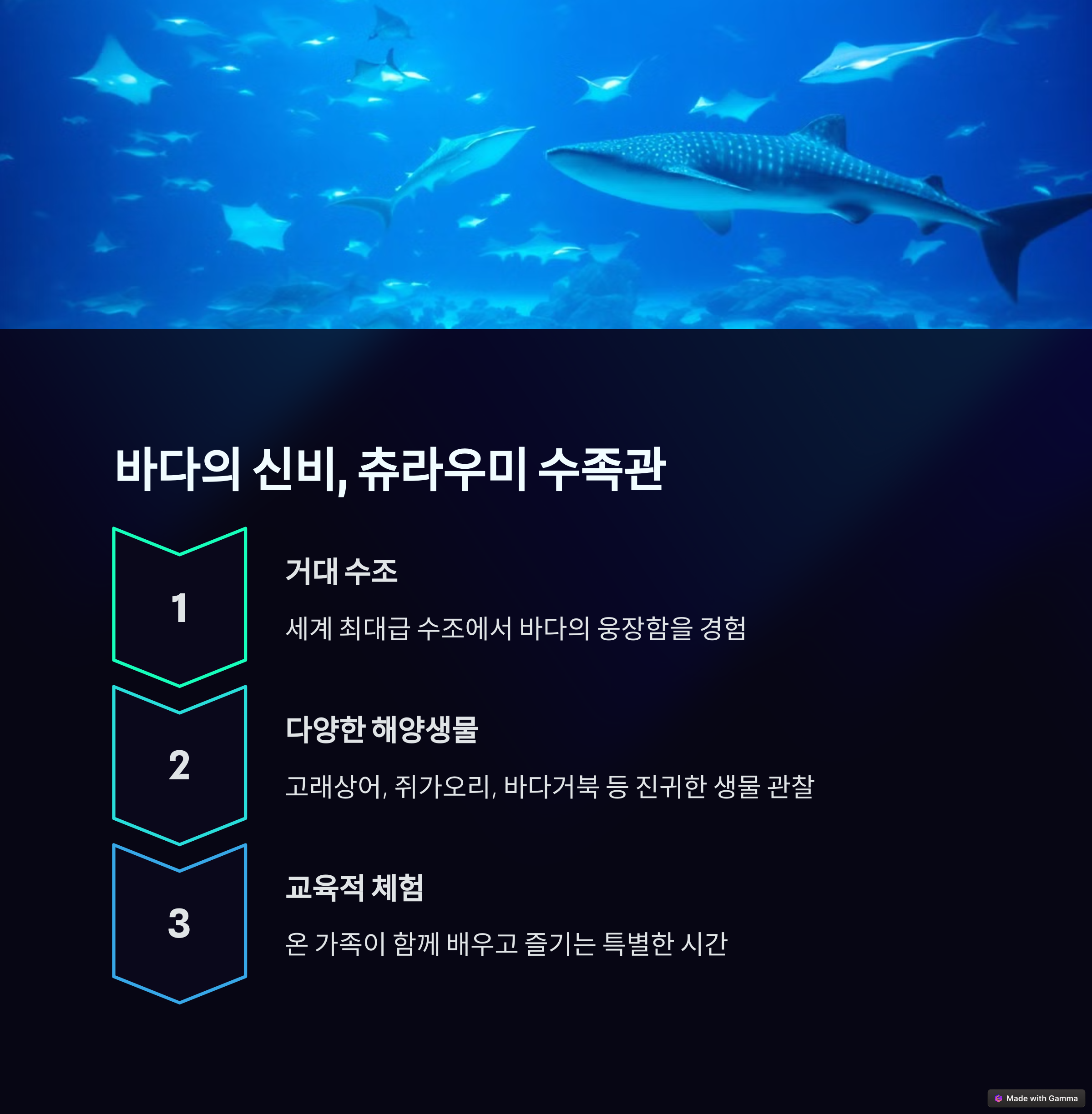 츄라우미 수족관은 오키나와 여행의 하이라이트입니다. 세계 최대 규모의 수족관 중 하나로, 고래상어, 쥐가오리, 바다거북 등 다양한 해양 생물을 관찰할 수 있습니다. 가장 인기 있는 고래상어 쇼는 하루 2~3회 진행되므로 방문 전에 쇼 일정을 미리 확인하는 것이 좋습니다.