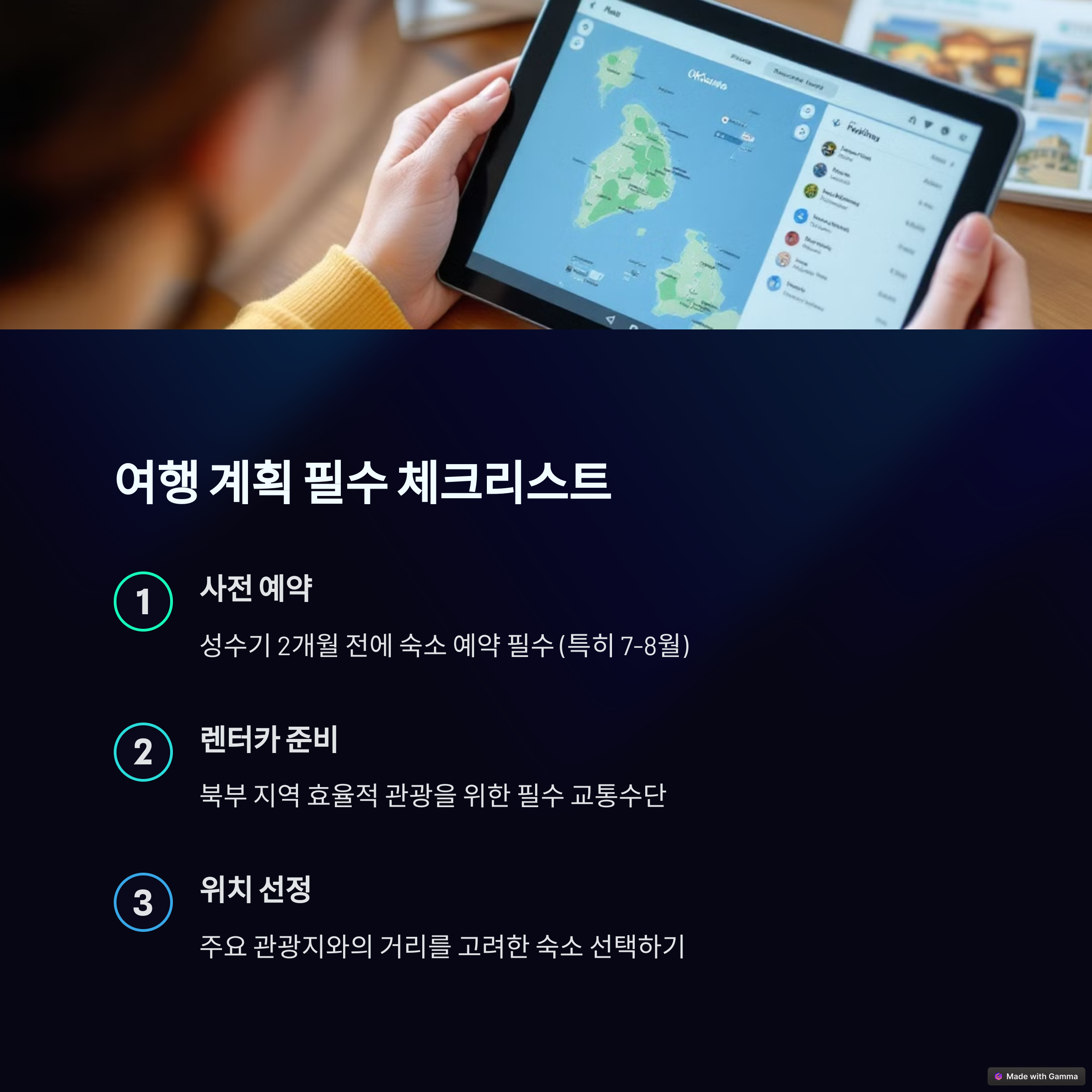 성수기(7~8월)에는 숙소가 빠르게 마감되므로 최소 2개월 전 예약을 추천합니다. 또한, 렌터카 이용이 필수적이므로 관광 동선을 고려해 북부 숙소를 선택하는 것이 보다 효율적인 여행을 즐기는 방법입니다.