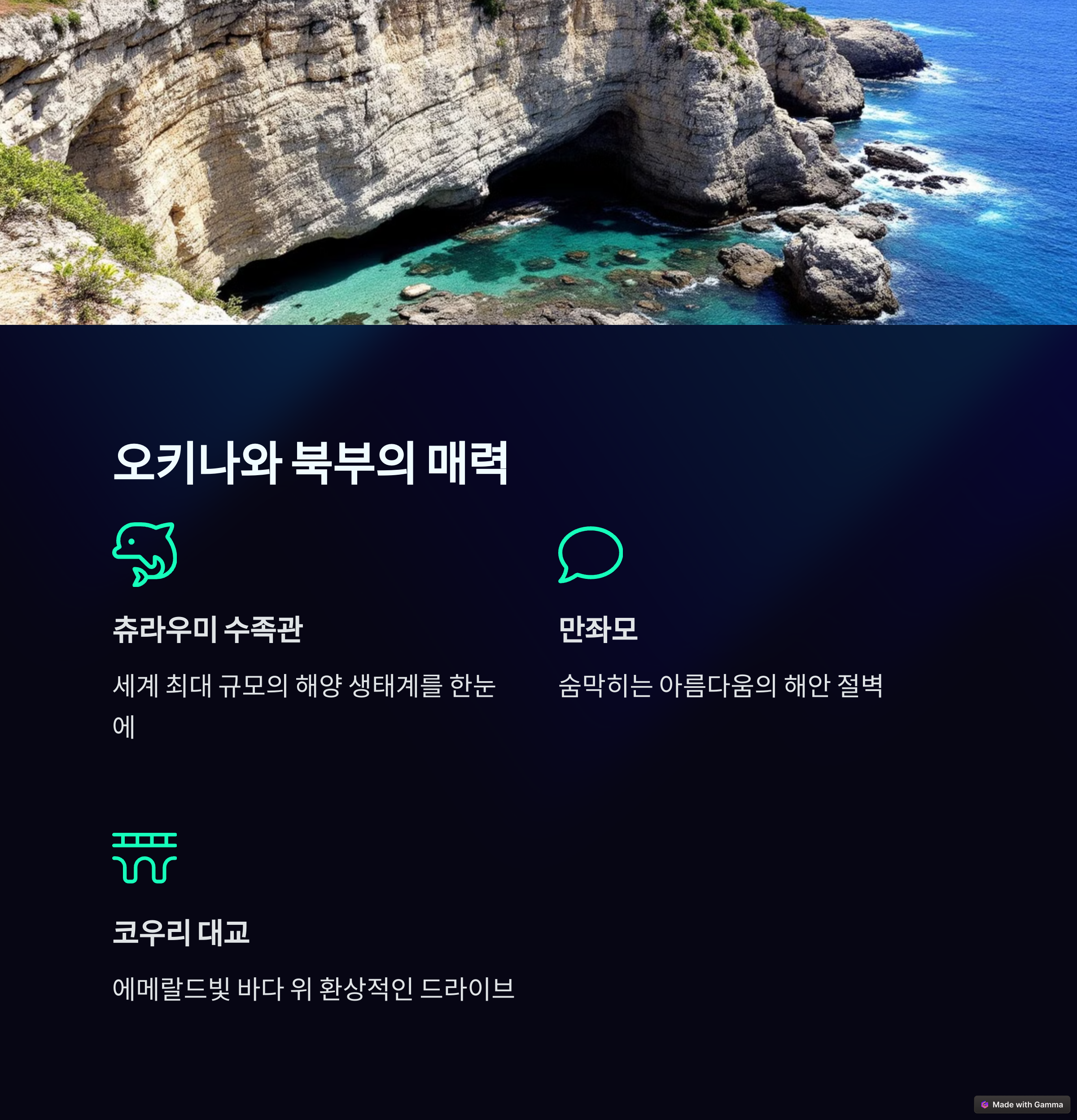 | 가족 여행 필수 코스 | 츄라우미 수족관, 오리온 모토부 리조트 & 스파, 코우리 대교 드라이브 |