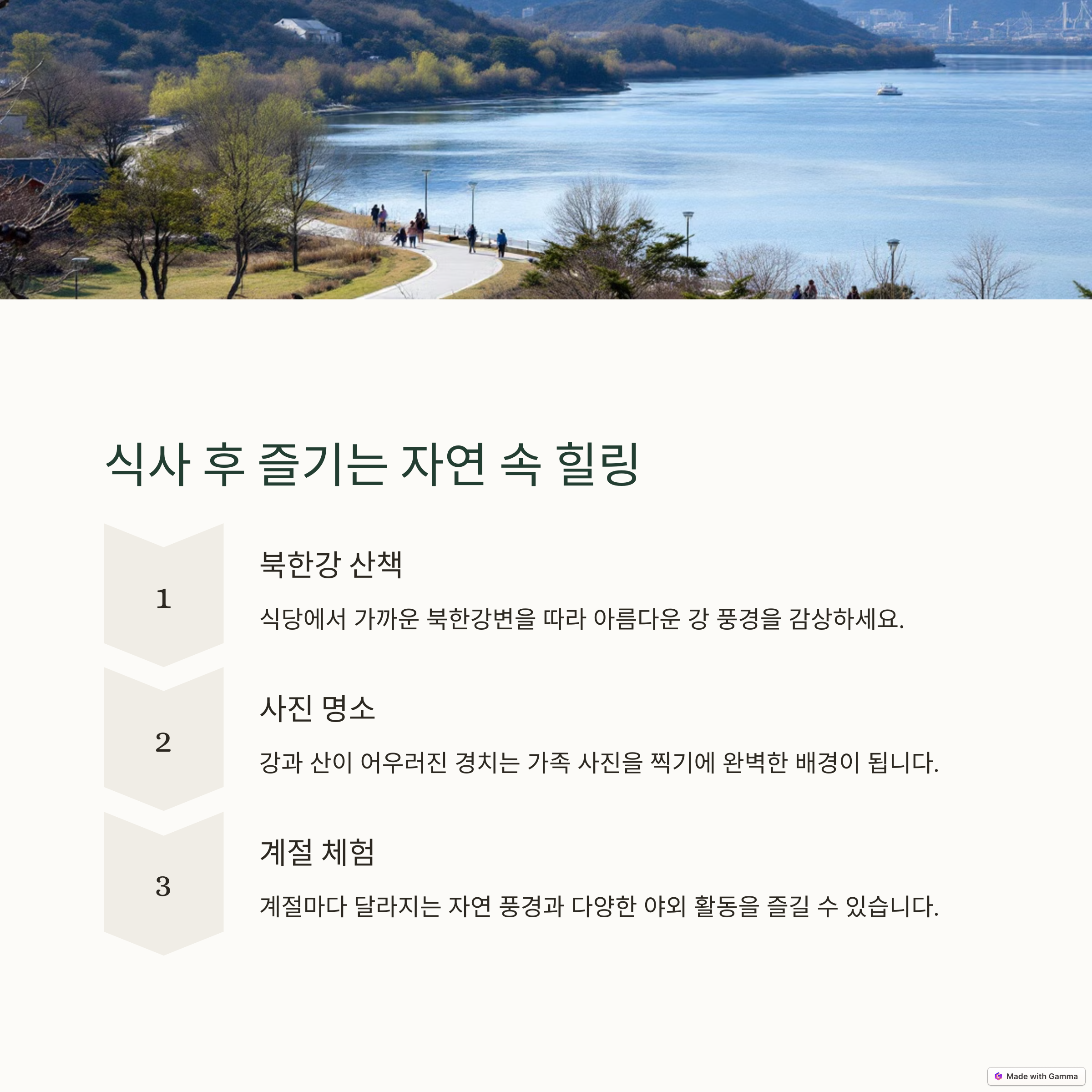 또한, 인근에는 북한강과 남한강이 흐르고 있어 식사 후 산책하기 좋은 환경이 조성되어 있습니다. 따뜻한 날씨에는 강변을 따라 걸으며 아이와 함께 여유로운 시간을 보내기에도 좋습니다.