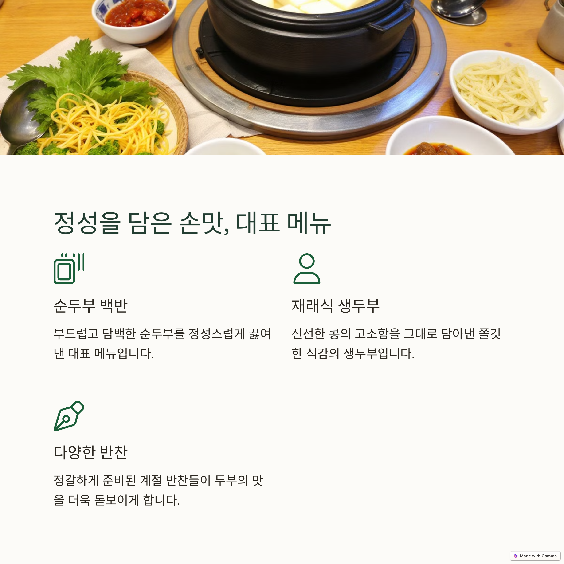 한옥 스타일의 식당에서 부드러운 순두부와 고소한 재래식 생두부를 맛볼 수 있으며, 다양한 반찬이 함께 제공되어 푸짐한 한 끼 식사를 즐길 수 있습니다. 영업시간은 매일 10:00~20:30 (라스트오더 20:00)로 운영됩니다.
