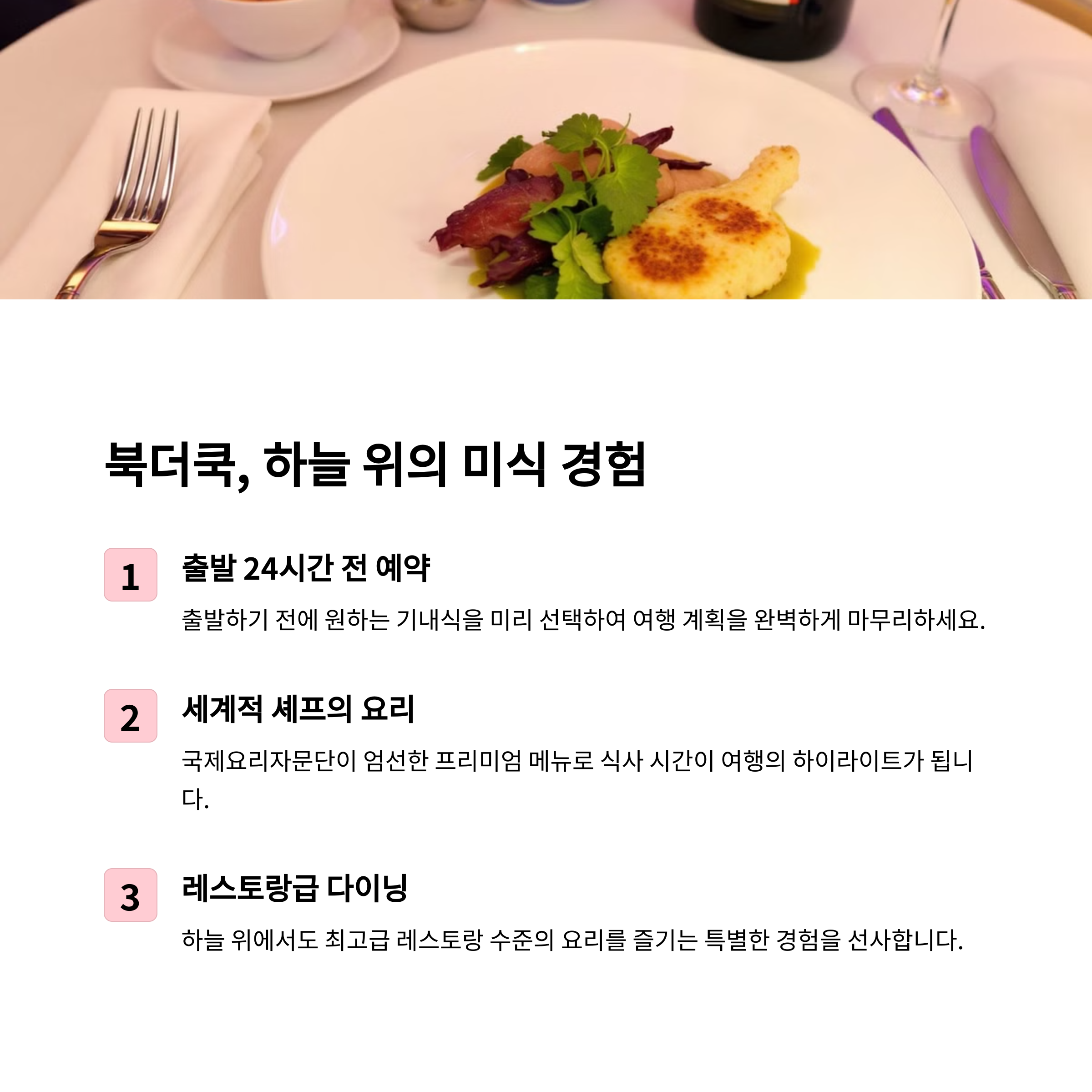 ✔ 북더쿡 서비스는 출발 24시간 전까지 예약 가능합니다. ✔ 일부 인기 메뉴는 조기 마감될 수 있으니 미리 예약하는 것이 좋습니다.