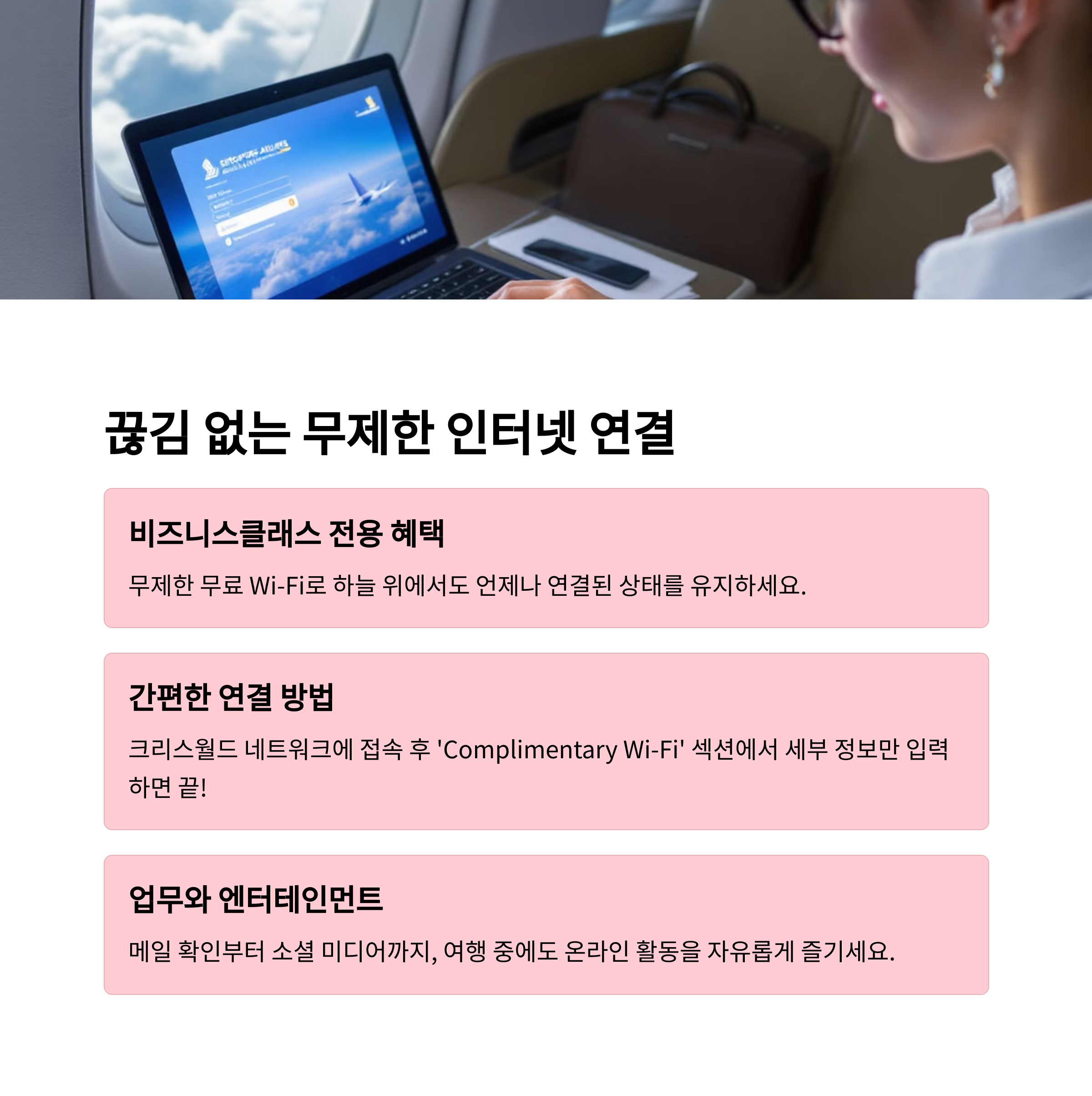 비즈니스클래스 무료 와이파이 이용법 ✔ 기내에서 크리스월드 네트워크(SQ Wi-Fi)에 연결 ✔ 기내 WiFi 포털 접속 후 ‘Complimentary Wi-Fi’ 선택 ✔ 항공권 정보 입력 후 무료 와이파이 이용 가능 ✔ 스트리밍은 제한되며, 메신저 및 웹서핑 가능