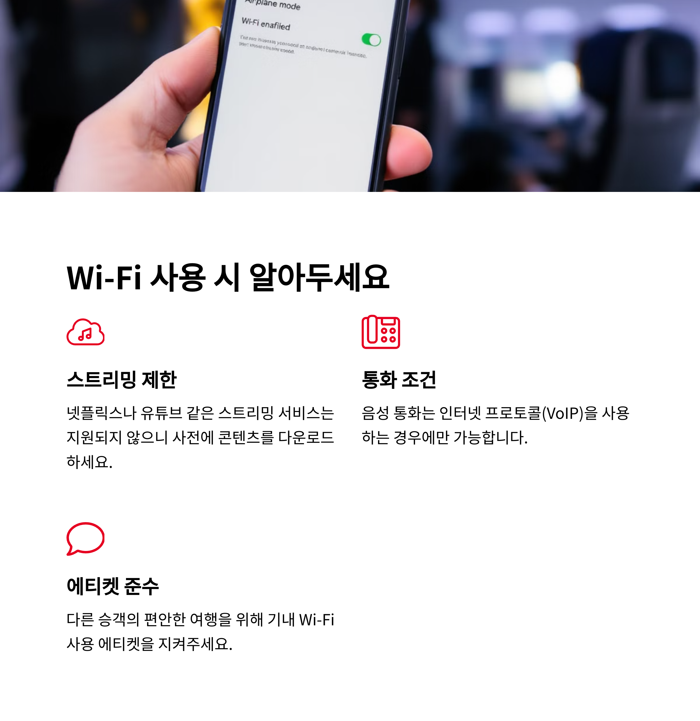 | 무료 와이파이 | 기내 포털에서 인증 후 사용 | 메신저 & 웹서핑 가능 (스트리밍 불가) |
