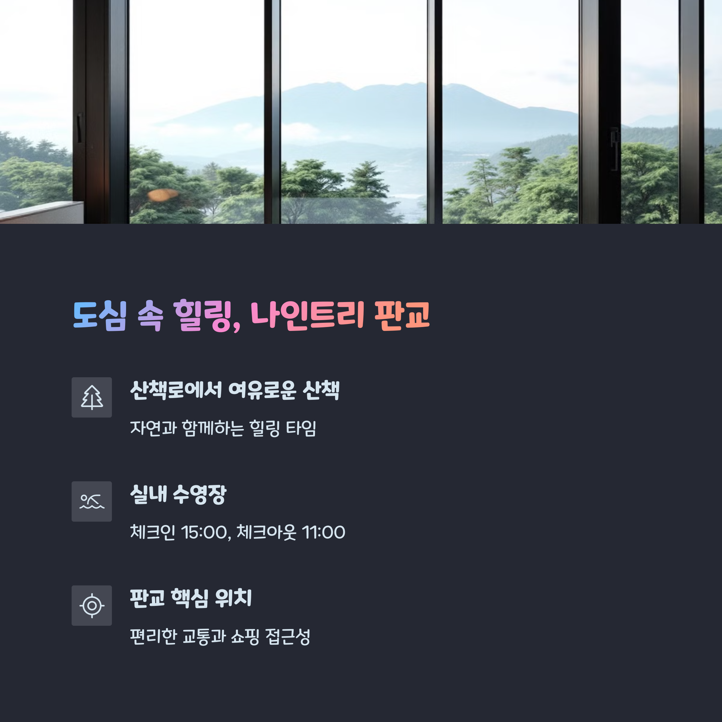 | 자연 속 힐링 | 감각적인 인테리어 | 가성비 호캉스 |