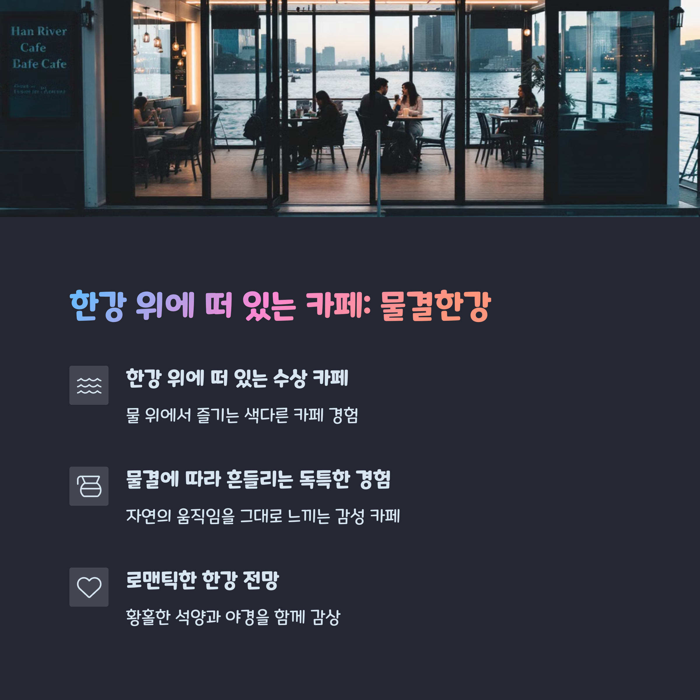 | 물결한강, 헤이, 리버 커피 | 버티고, 프리빌리지 바 | 텔러스 9.5, 한강 루프탑 |