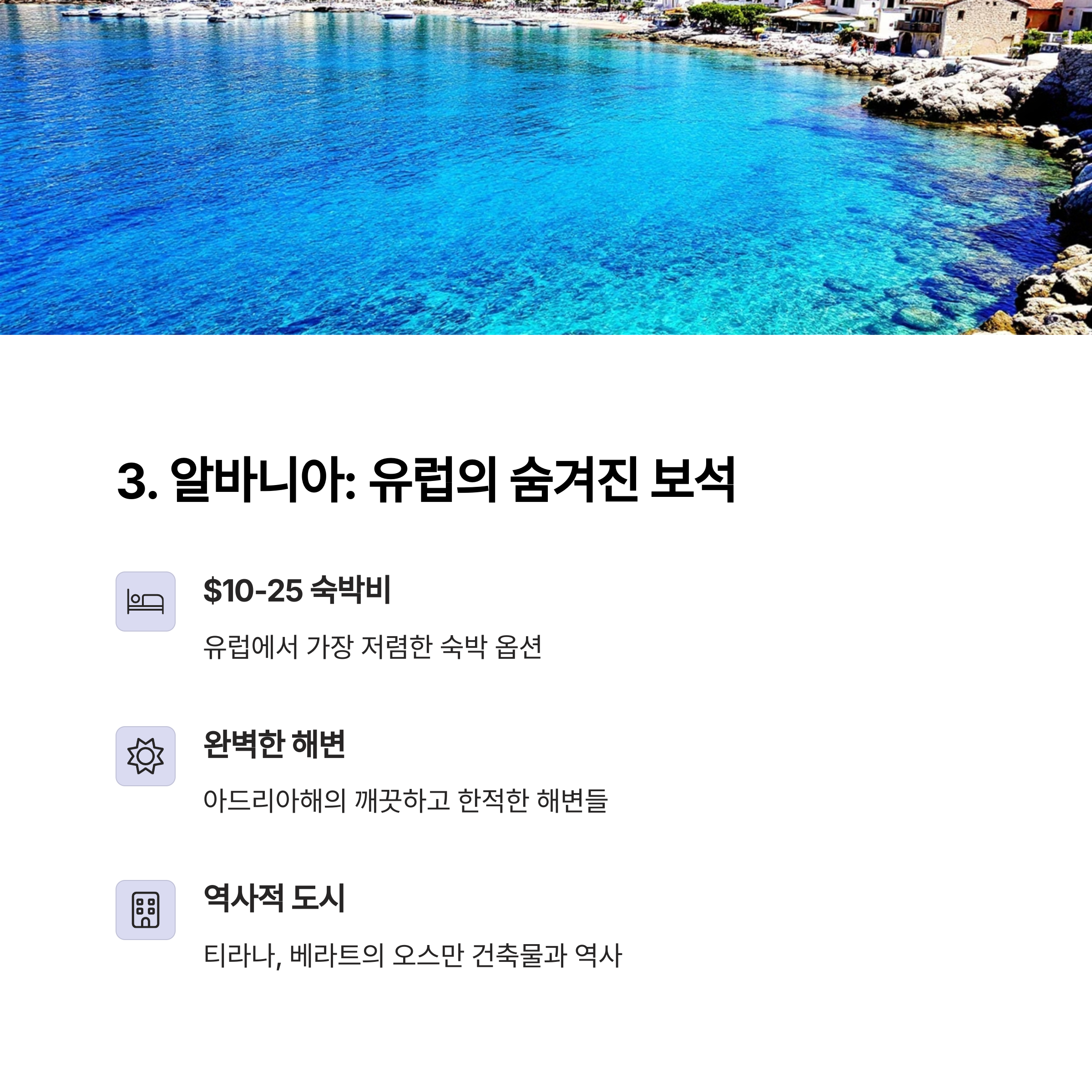 유럽을 여행하고 싶지만 물가가 부담된다면 알바니아가 좋은 대안이 될 수 있습니다. 유럽에서도 손꼽히는 저렴한 국가로 숙박비는 $10~25 수준이며, 아름다운 해변과 역사적인 고도(古都)까지 경험할 수 있습니다. 태국 역시 북부 지역인 치앙마이를 중심으로 하루 $30 정도의 예산으로 여행이 가능하며, 저렴한 현지 음식과 마사지 문화도 즐길 수 있습니다. 마지막으로 캄보디아는 하루 $25 예산으로 앙코르와트 유적지를 감상할 수 있어 역사 애호가들에게 추천됩니다.