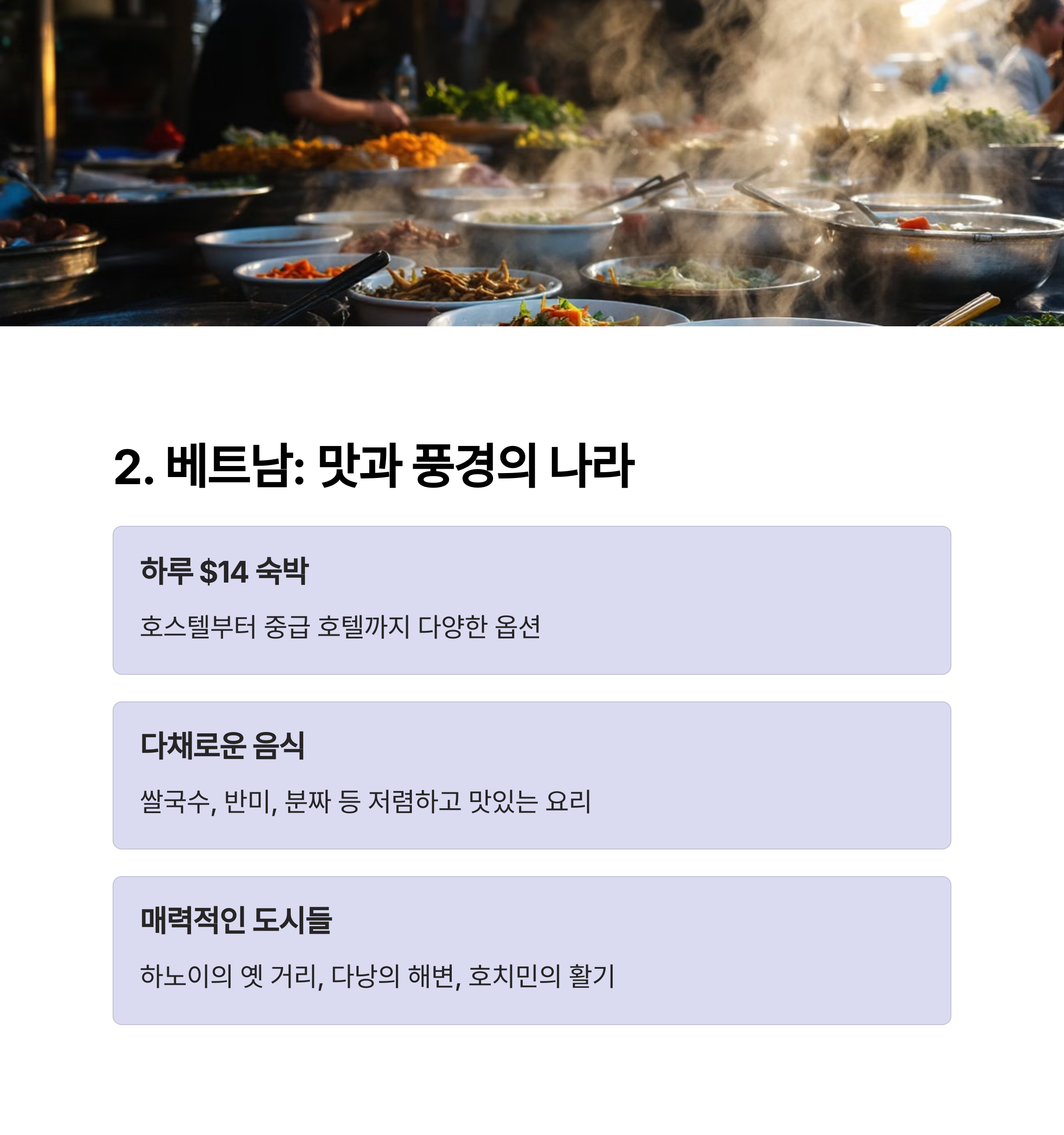 | 베트남, 멕시코, 태국, 캄보디아, 알바니아 | 하루 $14~$40 수준으로 여행 가능 | 저렴한 물가, 풍부한 문화, 관광 명소 |