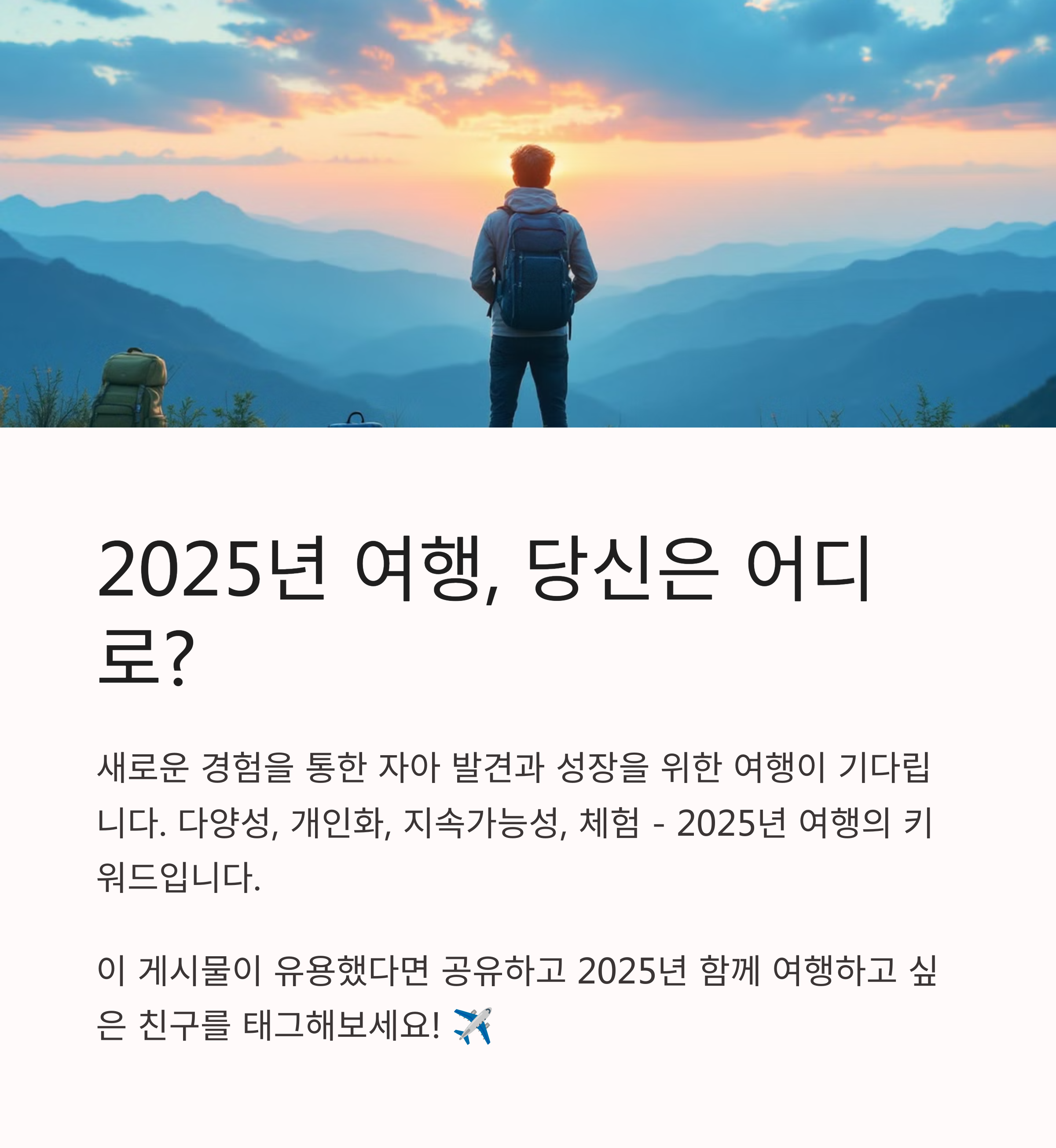 여행 트렌드는 빠르게 바뀌지만, 진짜 중요한 건 나에게 맞는 여행입니다. 2025년은 다양한 방식의 여행이 공존하며 각자의 방식대로 떠날 수 있는 다양성의 시대이기도 해요. 이번 글을 통해 새로운 여행지와 트렌드를 발견하셨다면 올 한 해 나만의 여행을 멋지게 설계해보세요!