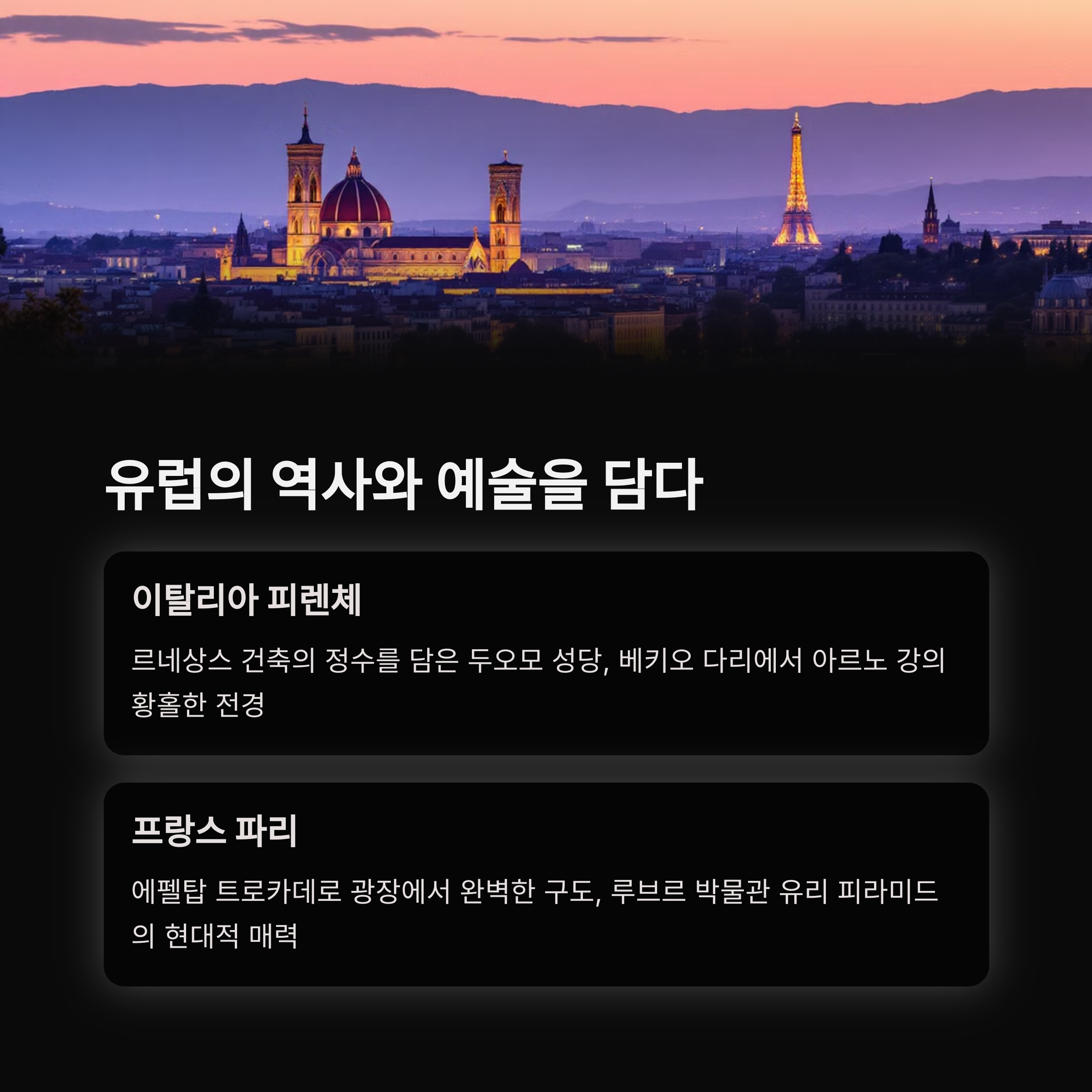 유럽에서는 이탈리아 피렌체와 프랑스 파리가 대표적인 인생샷 명소입니다. 르네상스 건축물이 가득한 피렌체에서는 아르노 강 너머 두오모 대성당과 석양을 함께 담은 장면이 최고예요. 파리는 어디를 가든 사진이 작품처럼 나오지만, 에펠탑 야경이나 세느강 유람선 배경도 놓칠 수 없죠. 반면, 자연 속 특별한 사진을 원한다면 캐나다 옐로나이프에서의 오로라 인생샷이 제격입니다.