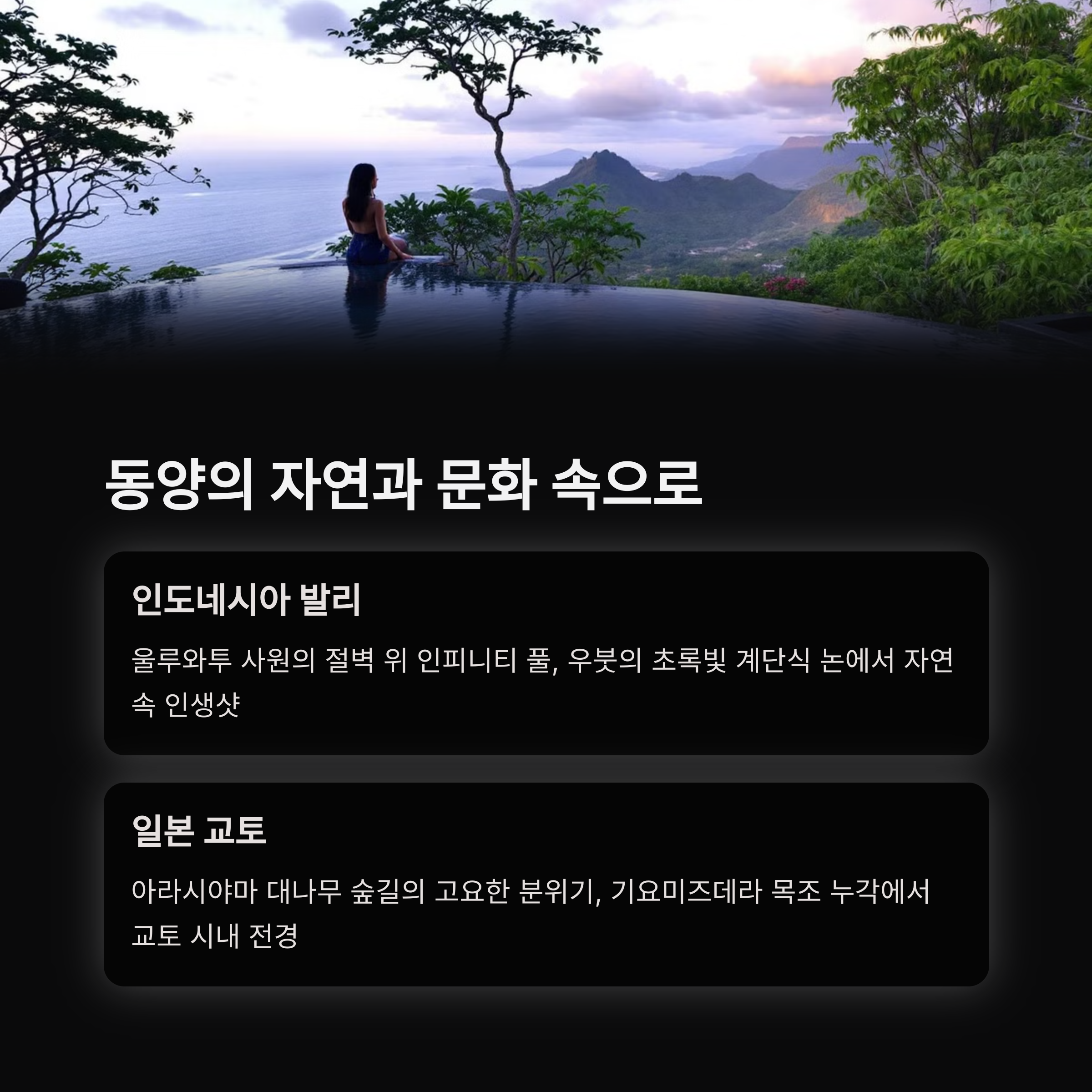| 산토리니, 파리, 피렌체, 후쿠오카, 교토 | 옐로나이프, 보라카이, 그랜드 캐니언, 레이캬비크 | 발리, 오로라 촬영지, 대나무숲, 유럽 골목길 |